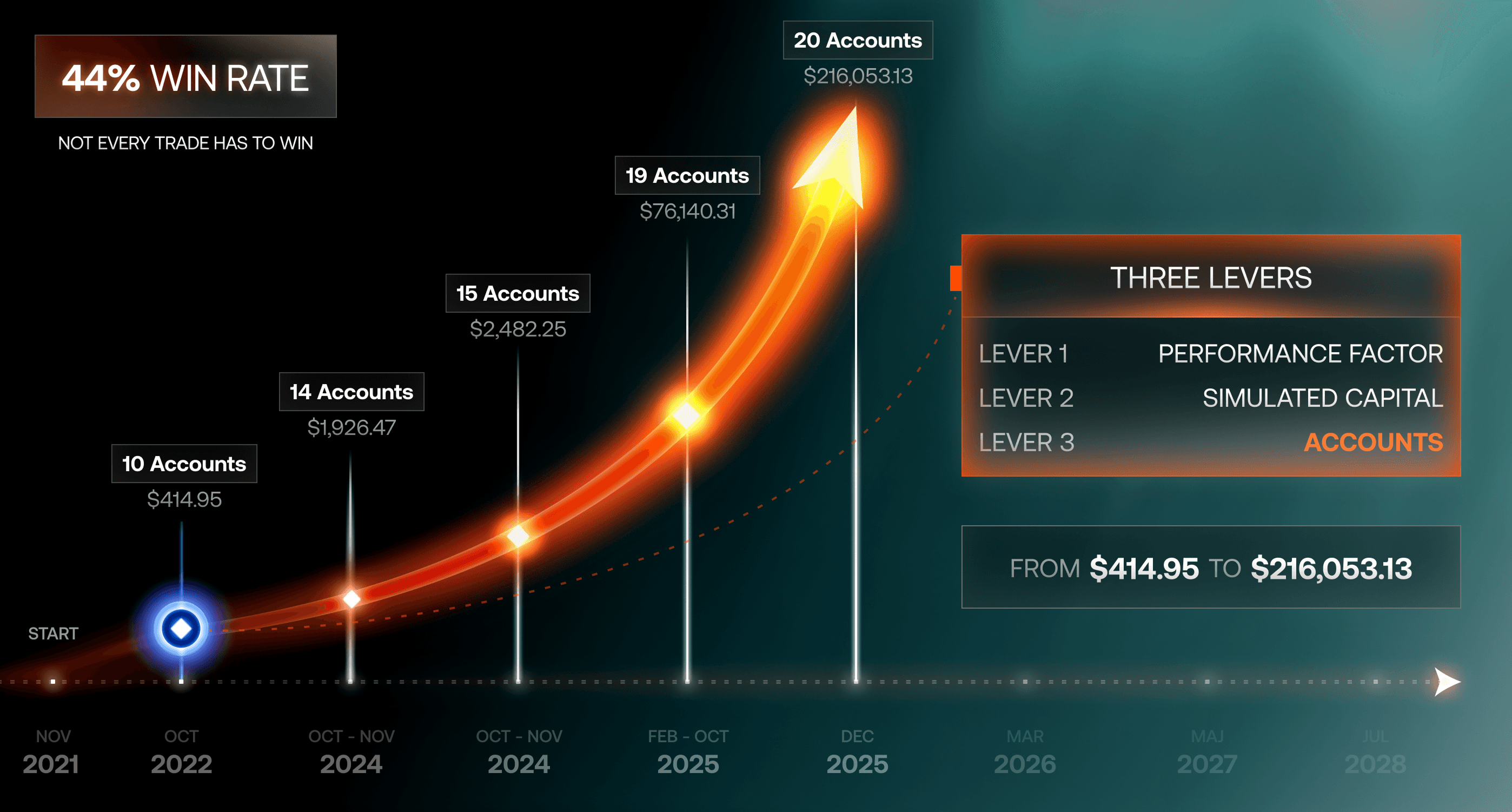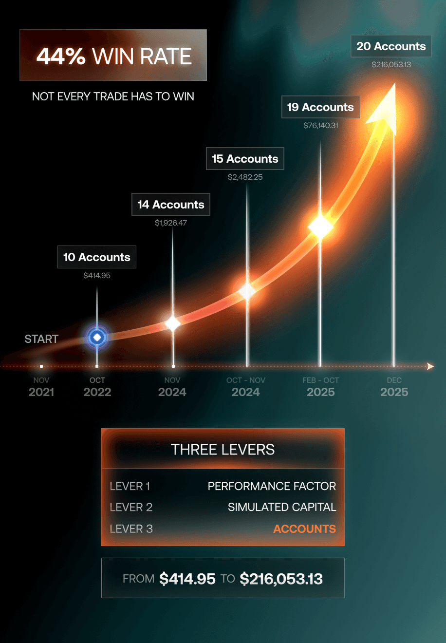 Later, the shape of the journey changed. By 14 Accounts, he hit his first $116,000 Six-Figure Payout — about a 280x Increase from where the payout trail began. By 20 Accounts, that curve had stretched to $216,053.13 — roughly a 520x Increase over the first payout.