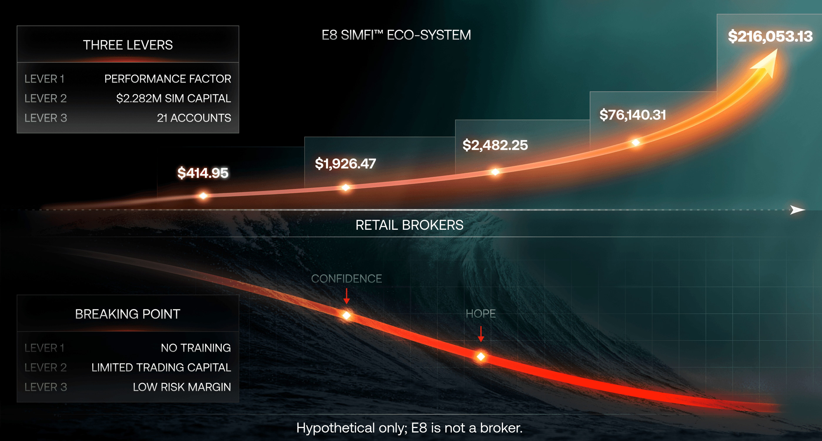 No. E8 is positioned as Simulated Finance (SimFi), with performance-based payouts according to program terms. It is not presented as a live-funded account offer.