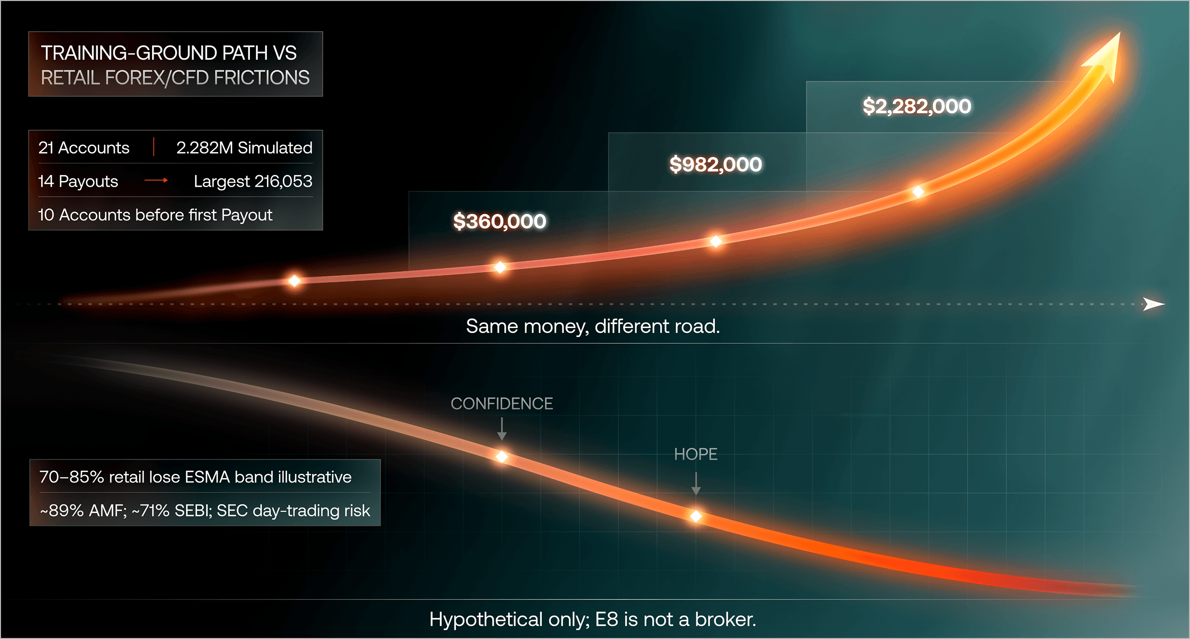 E8's SimFi model is a simulated environment built for education, discipline, evaluation, and performance-based payouts according to program terms.