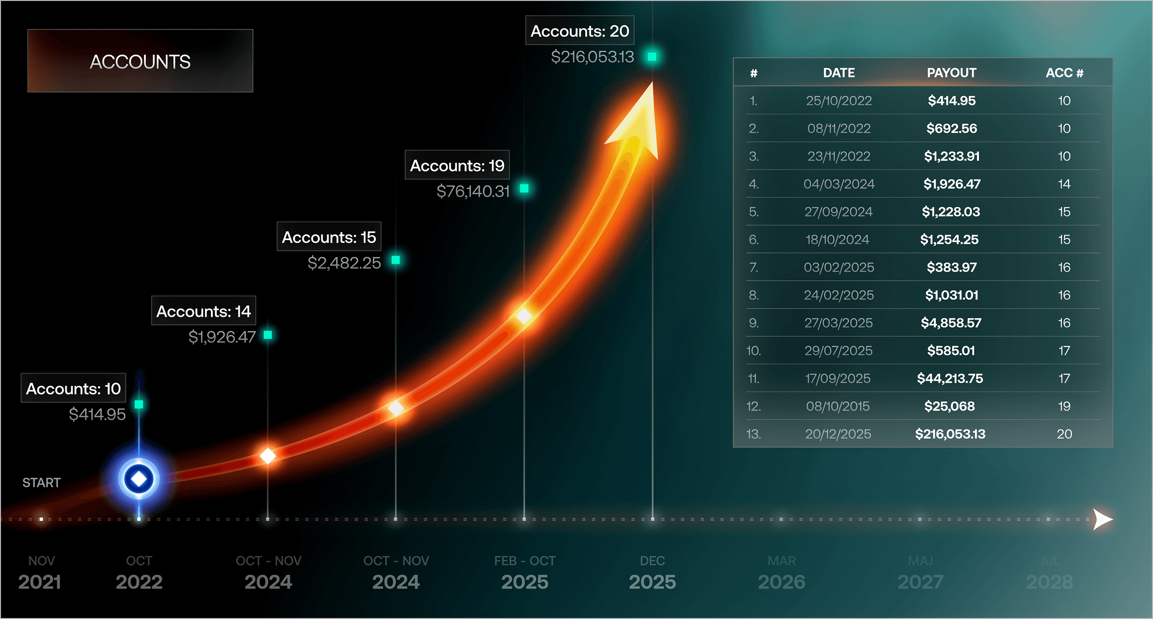 This is how our top traders multiply their results: by trading an average of 10–20 accounts. This puts you in the same environment where our most disciplined, consistent, and profitable traders are developing their skills.